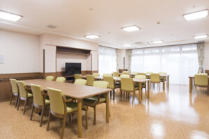 相談室、応接室、食堂兼機能訓練室、機能訓練室、健康管理室、洗濯室、浴室、機械浴室、脱衣室、エレベーター、共用トイレ(車いす対応トイレ)、理美容室、駐車場