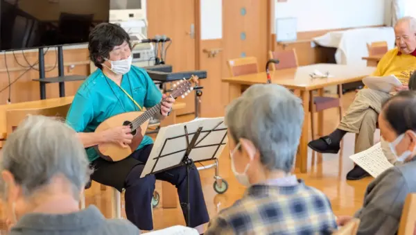 お食事は館内で調理し、その日のお身体の状態に合わせて量や形態を調整したメニューをご提供することで、「食」を楽しめる工夫を凝らしています。(写真はスタッフによるマンドリン演奏です)