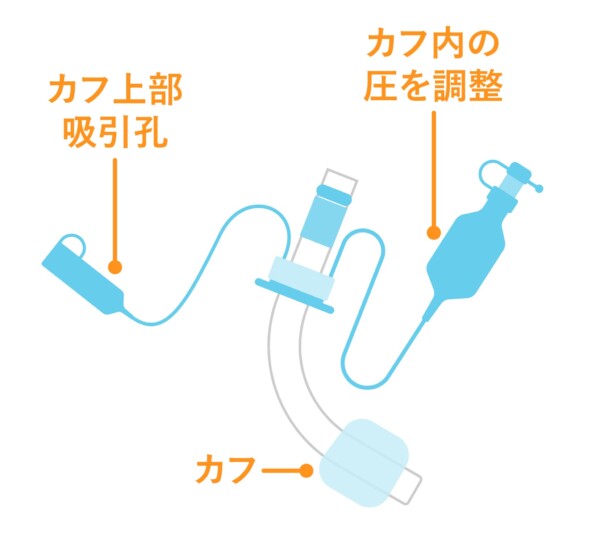 カフ付きは、主に人工呼吸器を使用している方や、唾液などの飲み込みが困難で誤嚥のリスクが高い方に使用されます。