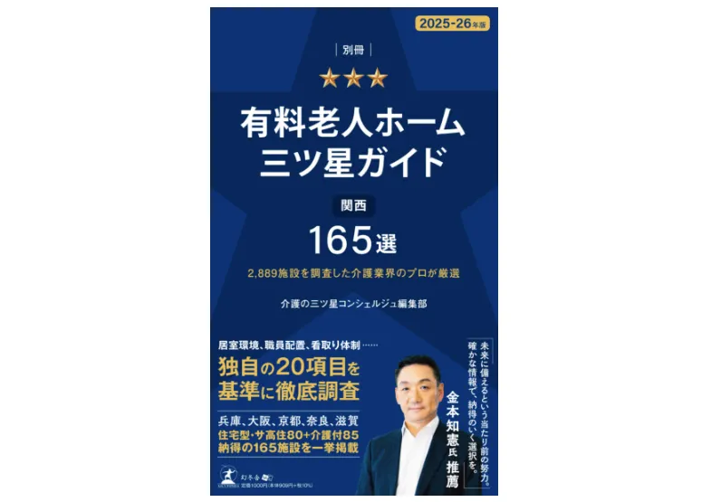 『有料老人ホーム三ツ星ガイド』は、関西圏2,889施設以上の有料老人ホームを対象に、介護・医療・住環境の専門家が書類審査や現地取材などを通じて評価を行い、厳選された165施設のみを掲載するガイドブックです。