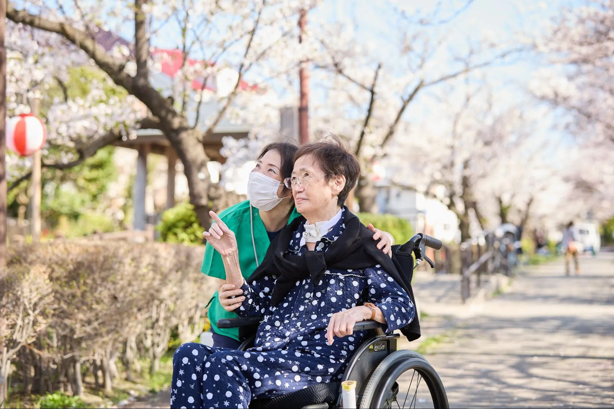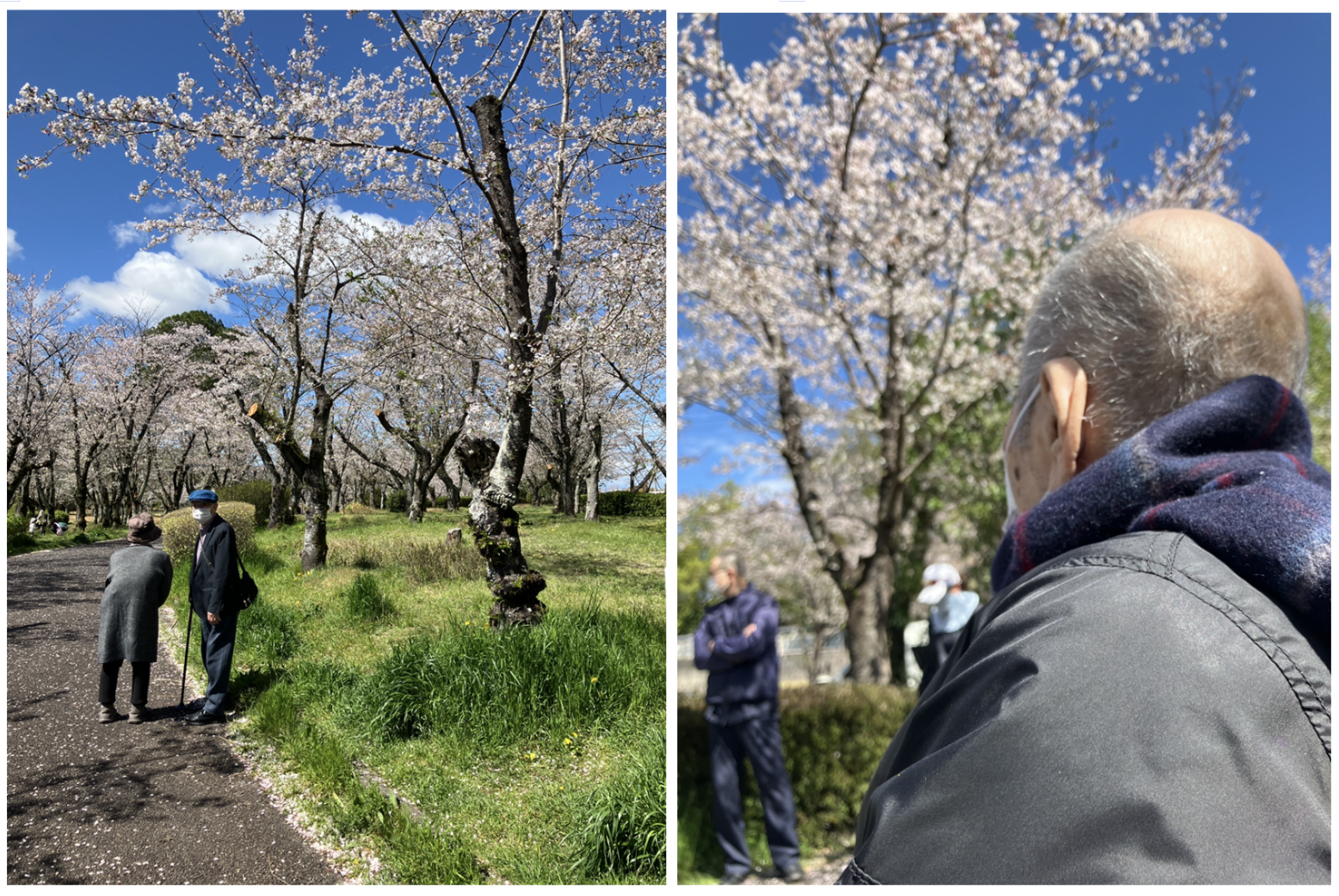 桜を眺めるご入居者さま。この季節を楽しみにされているご入居者さまがたくさんいらっしゃいました。