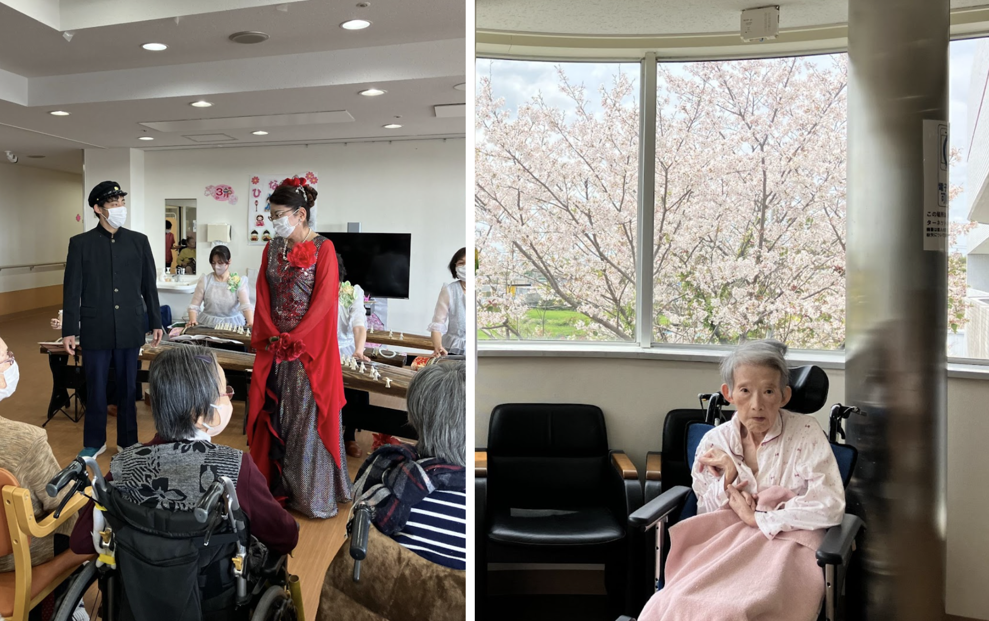 (写真左)曲のテーマにあわせてスタッフが高校生や歌謡曲の歌手になりきって楽しんでいただきました。(写真右)施設の窓から見える桜も満開でした🌸