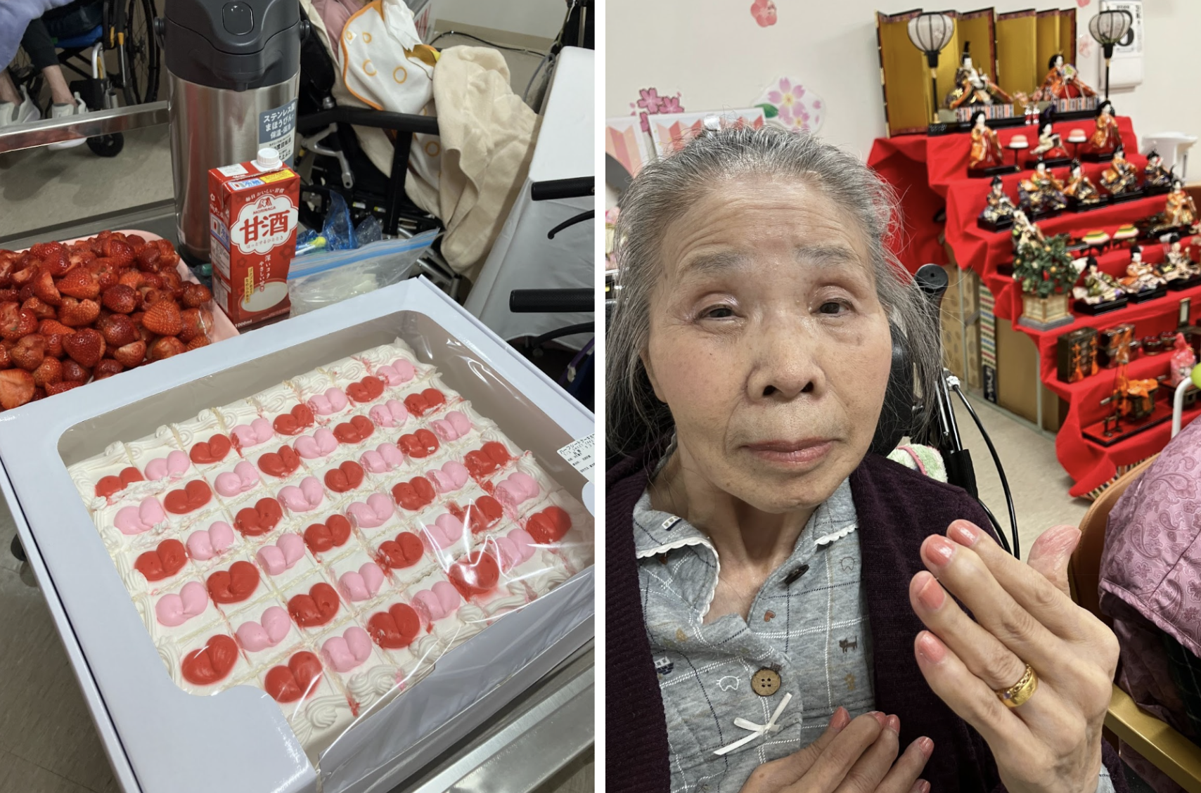 (写真左)ひな祭りを祝うイチゴとケーキ、甘酒を皆さんで楽しみました♪(写真右)ネイルとメイクでドレスアップされたご入居者さま✨️
