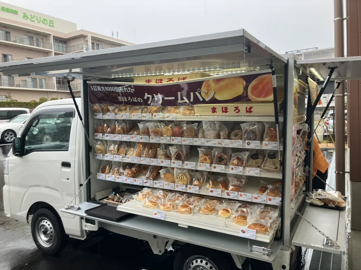 大人気の移動パン屋さん『まほろば』さん。名物のクリームパンをはじめ、たくさんの種類が並びます♪