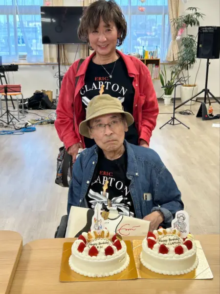 南町田では、エリック・クラプトンを愛してやまないご入居者さまのために、演奏会を開催。ご入居者さまのクラプトンのファンクラブ仲間とともに楽器演奏と歌を披露しました。当日はクラプトンの誕生日前日。参加者でケーキを囲んでお祝いをしました。