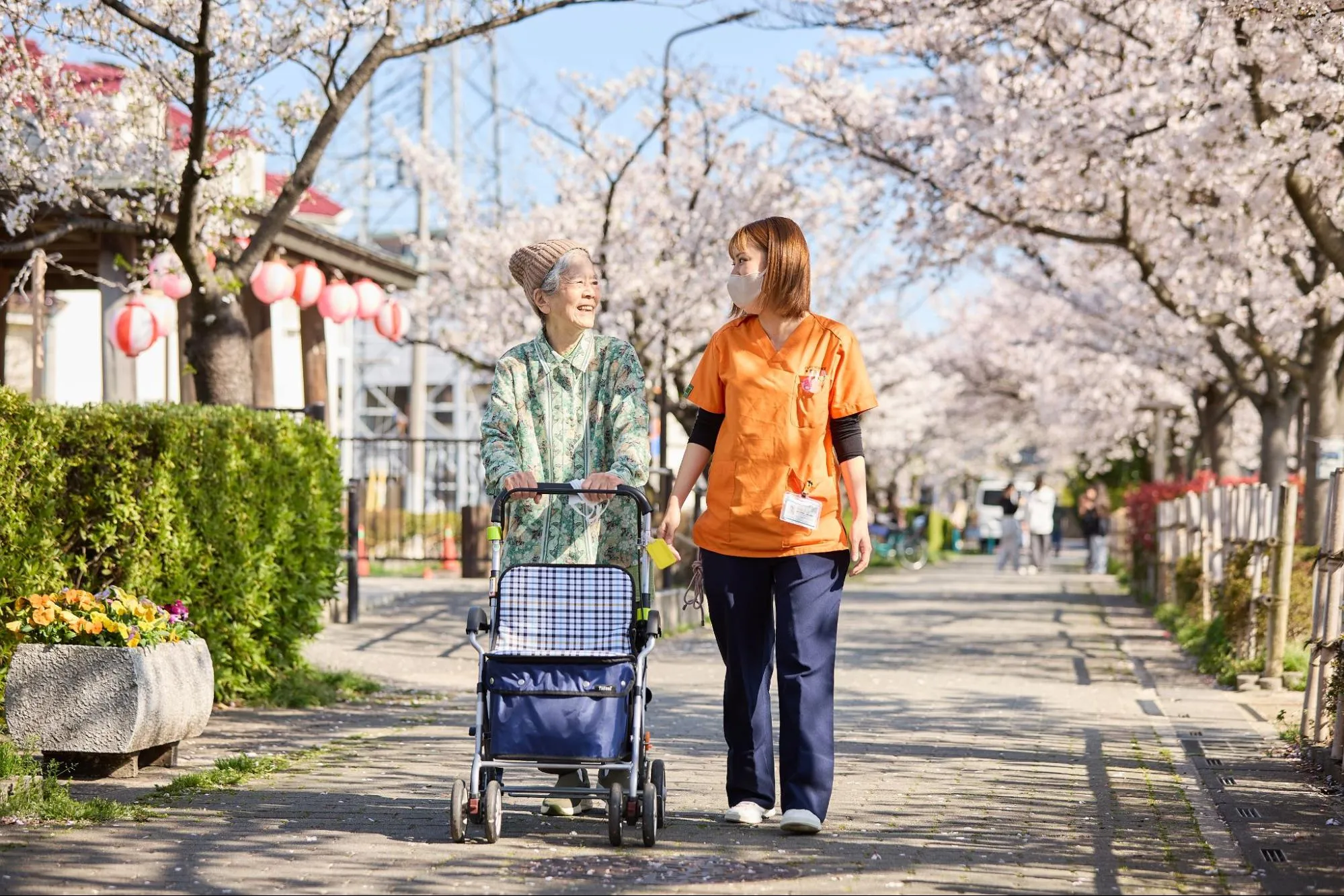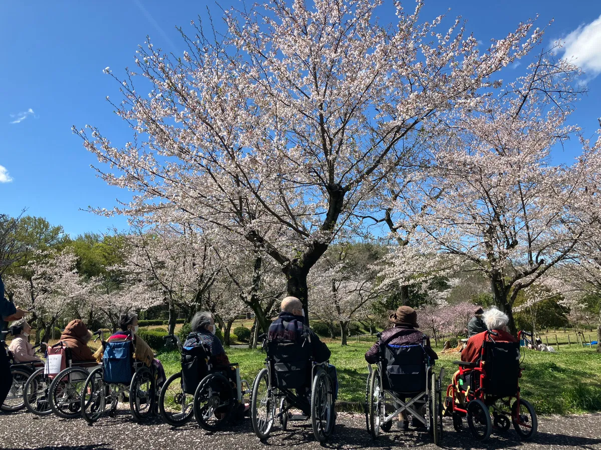草加松原では、施設のすぐそばの公園で開催される「桜まつり」をご入居者さまと楽しみました。