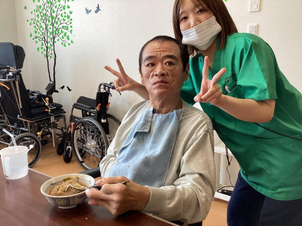 自らおかわりされる姿にスタッフ一同大喜び。普段は食事介助が必要な場面もありますが、その方はご自身のスプーンをしっかりと握り、ゆっくりとおいしそうに二杯目を召し上がると、満足げな表情で一言。