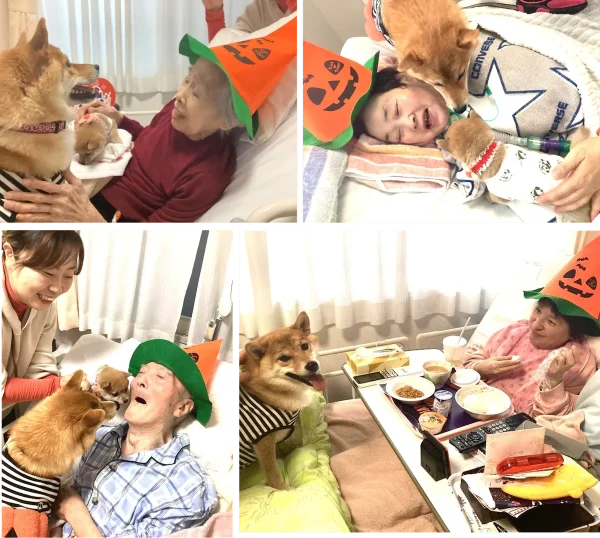札幌北のハロウィンには、かわいいスペシャルゲストとして2匹のワンちゃんが登場!看護主任のスタッフが飼っているワンちゃんが全居室をまわり、ご入居者さま一人ひとりに寄り添うようにふれあい、自然と笑顔があふれる時間となりました。