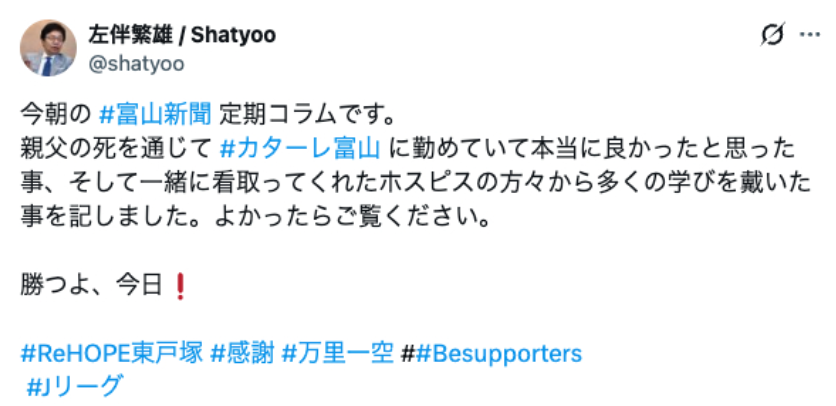 執筆者は、プロサッカーチーム「カターレ富山」の代表取締役社長である左伴繁雄さん。左伴社長のお父様がReHOPE 東戸塚に入居され、お看取りをした体験を綴ってくださったのです。