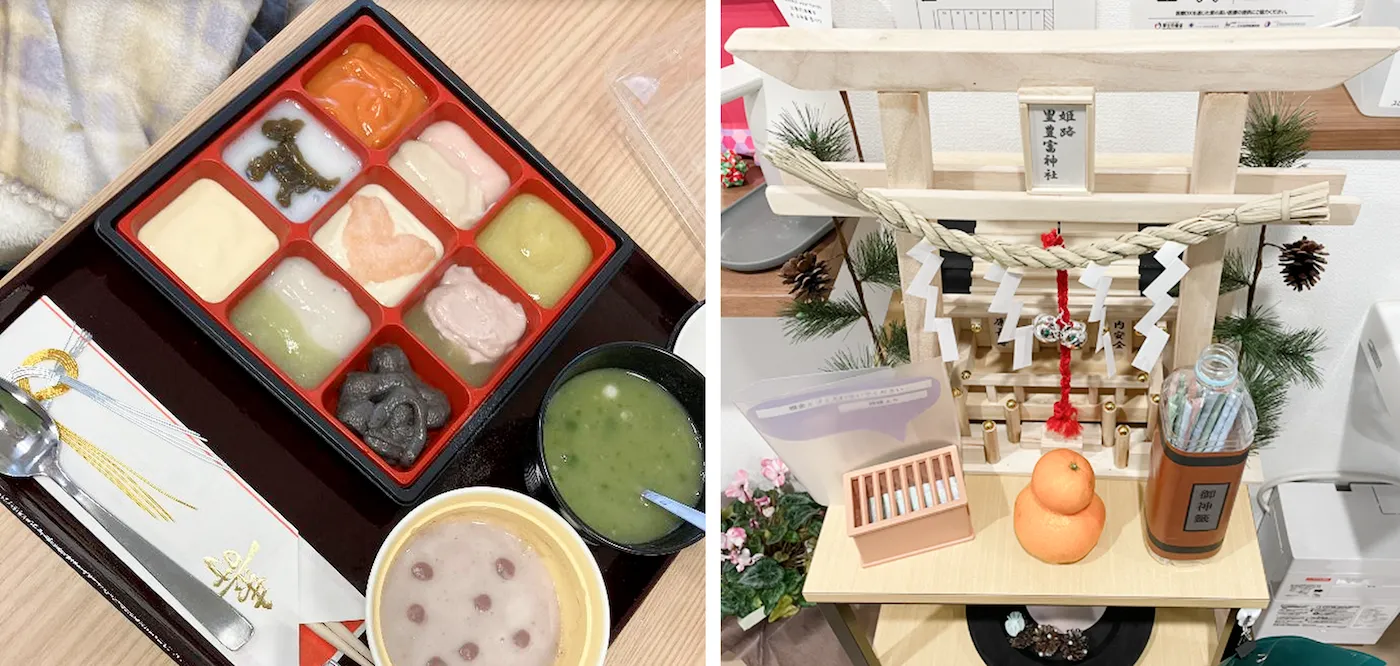 新年を迎え、当施設では元旦と2日にご入居者様が施設内に作られた神社を拝み、お汁粉を囲みながら穏やかな時間を過ごされました。普段お餅の摂取が難しい方には、溶けやすいお餅を使用し職員が見守りながら、無理のない形で楽しんで頂きました。あまりの嬉しさにまた涙をながして喜んで頂けました!