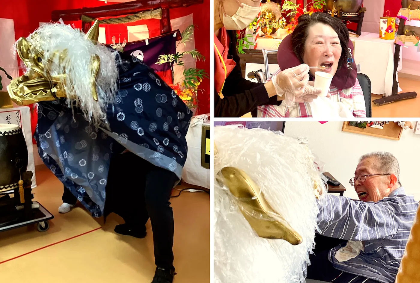 神社や獅子舞は施設長の三浦さんの自前の物を使わせて頂きました!獅子舞に頭をパクリとかじってもらい、笑顔溢れる時間となりました。