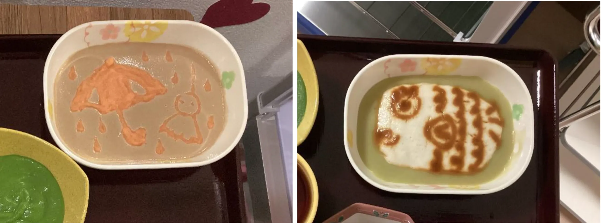 取り組みにあたって特別な道具は不要といいます。ミキサー食が入っているパウチの角を小さく切り、チョコペンのように絞り出したり、小さなフォークで形を整えたりして描かれています。