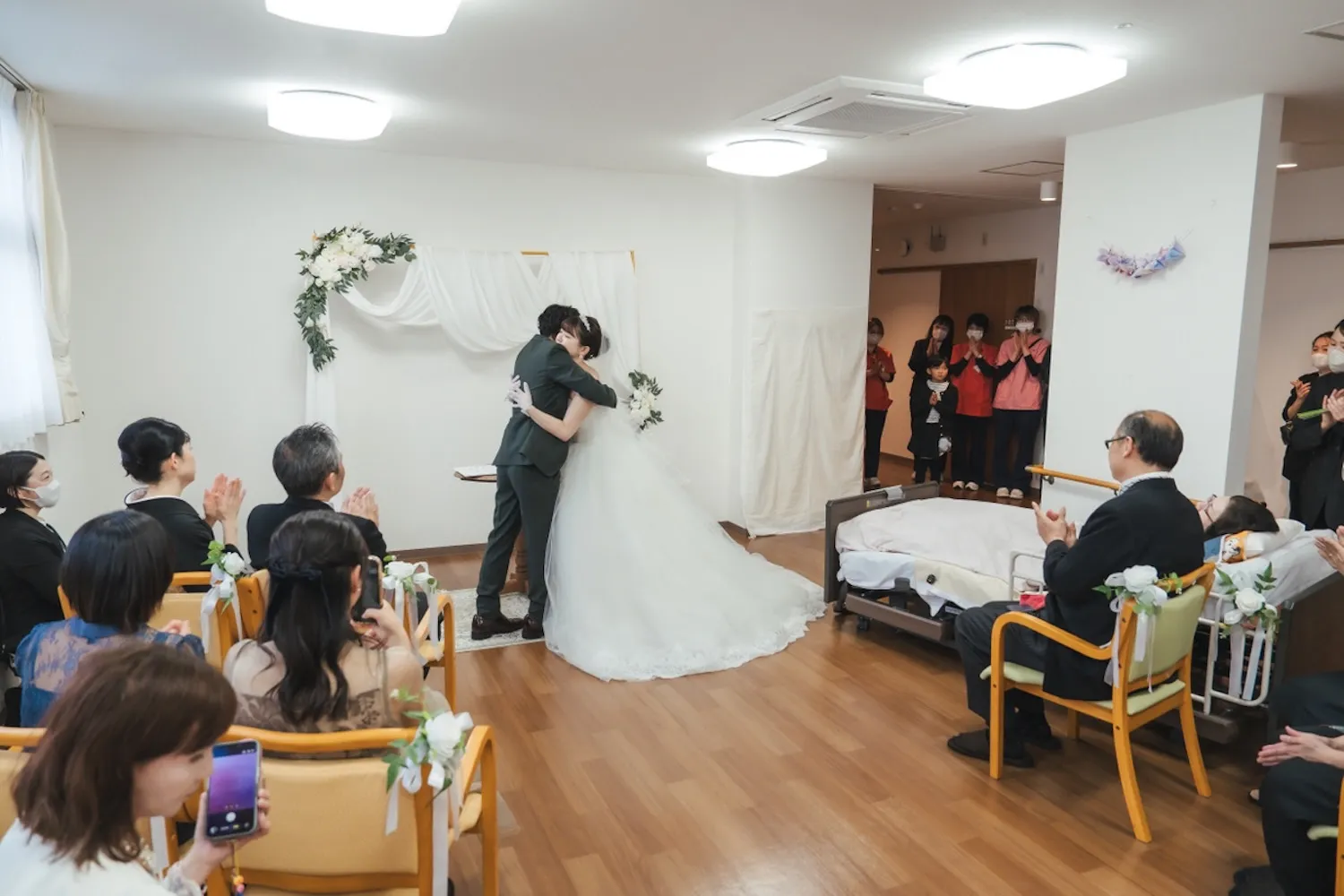 当日、日常の看護や介護業務が行われている中で、式の雰囲気を壊さないよう、スタッフさんがいつもの制服から黒のワンピースやスーツ姿に着替えてくださったことが印象に残っています。