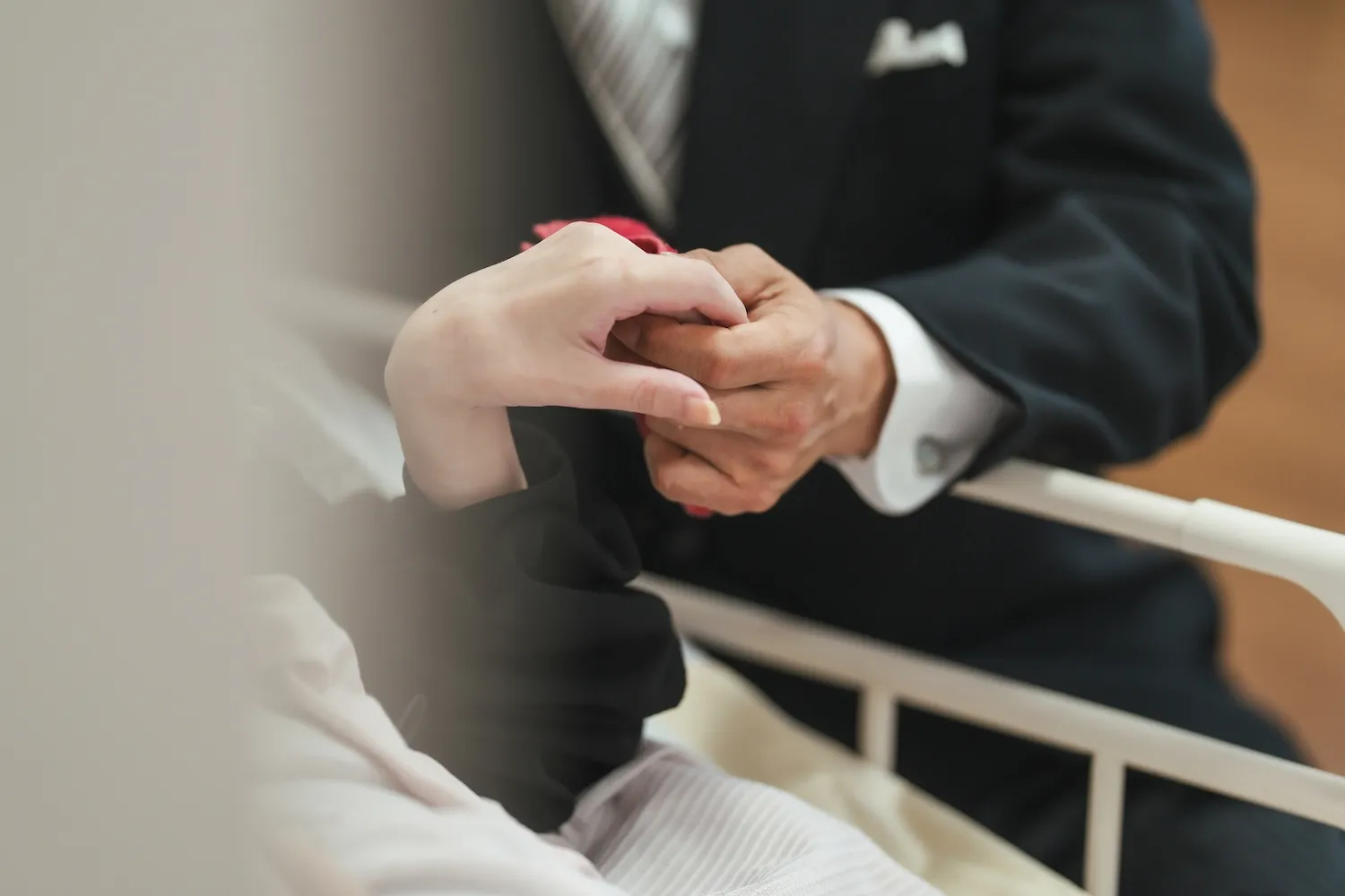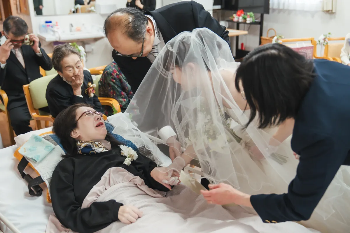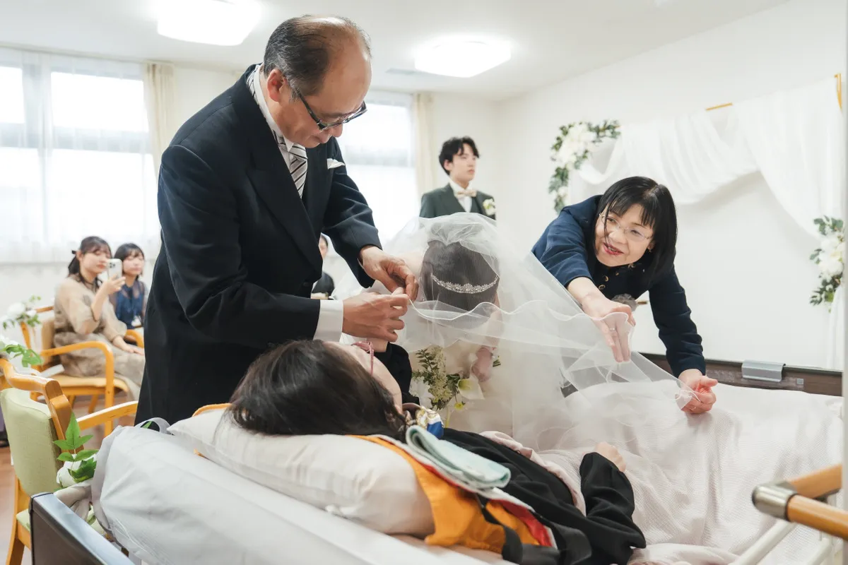 神経難病により運動機能が低下しているOさまは、ベッドに横になった状態で参列されました。それでも、新婦である娘さまの「最後の身支度」を整えるベールダウンは、配偶者さまとご親族に手を添えられる形でOさまが行いました。